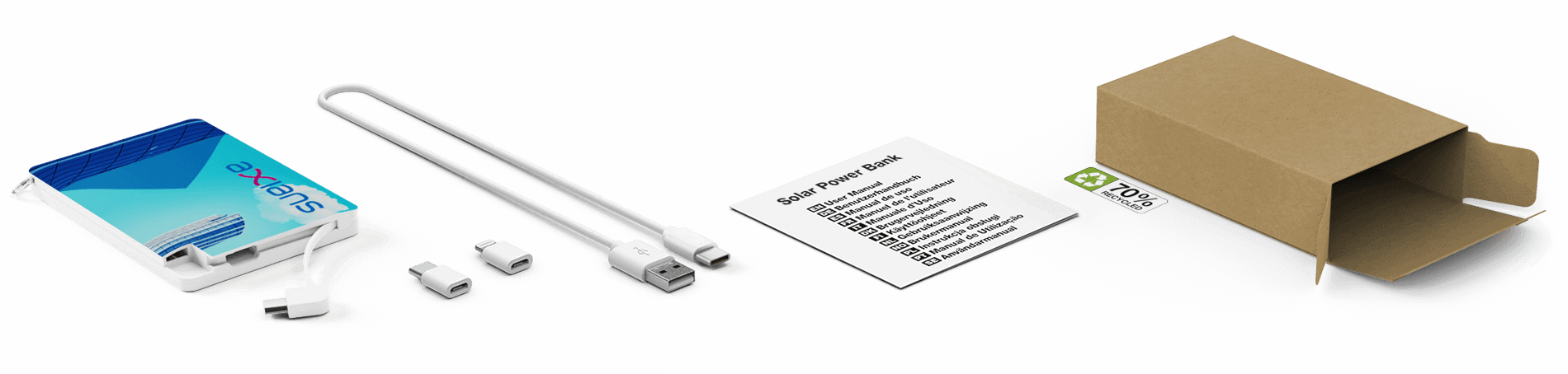 Außerdem verfügt sie über einen eingebauten Überladeschutz, damit Ihre Geräte beim Aufladen sicher sind. Und da sie mit allen Smartphones und Tablets kompatibel ist, ist sie die perfekte Backup-Option für unerwartet lange Tage außerhalb des Büros. Erweitern Sie Ihre Solar Card Powerbank mit unserem Zubehör, wie z.B. einem Karabinerclip für den einfachen und sicheren Transport außerhalb des Büros, oder werten Sie sie mit unserer Magnet Power Bank Box von einem Messegeschenk zu einem Firmengeschenk auf.