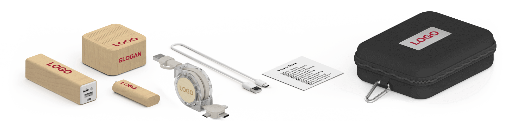 Kombinieren Sie 4 Produkte in 1 handlichem Geschenkset: Nature USB Stick, Maple Powerbank, Motion Wood USB Kabel, Seed Bluetooth® Lautsprecher. Die sorgfältig zusammengestellten Produkte in den Geschenksets können mit Ihrem Logo, Slogan, Kontaktdaten und Statements versehen werden. Die Oberfläche des Geschenksets kann mittels Lasergravur oder im Siebdruck, mit bis zu 4 Farben, gestaltet werden. Jegliche Farbkombinationen sind erlaubt.