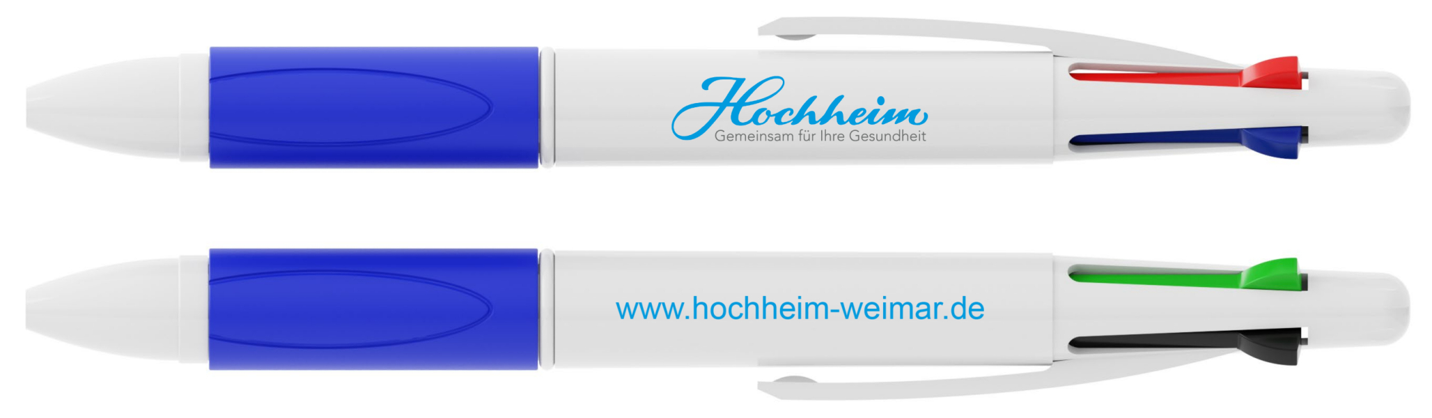 Der Quad ist ein klassischer 4-Farben-Stift mit blauer, roter, grüner und schwarzer Mine in einem Modell. Jede Farboption lässt sich über die Klickschieber an der Oberseite des Stifts ein- und ausfahren. Der bequeme Gummigriff ist in einer Vielzahl von Farben erhältlich, passend zu Ihrem eigenen Stil. Die weiße Außenhülle kann per Fotodruck mit Ihrem Logo, Slogan und mehr versehen werden.