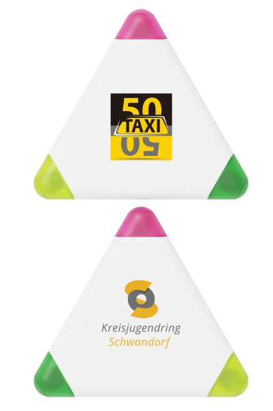 Unser dreifach Textmarkerstift beinhaltet jeweils einen grünen, gelben und pinken Highlighter. Die dreieckige Form ist ebenfalls populär als Giveaway. Wir können Ihr Logo, Ihren Slogan oder mehr auf den beiden Druckflächen aufbringen. Der Druck macht Ihr Unternehmen bekannt auf einem Modell, das häufig und gerne genutzt wird.