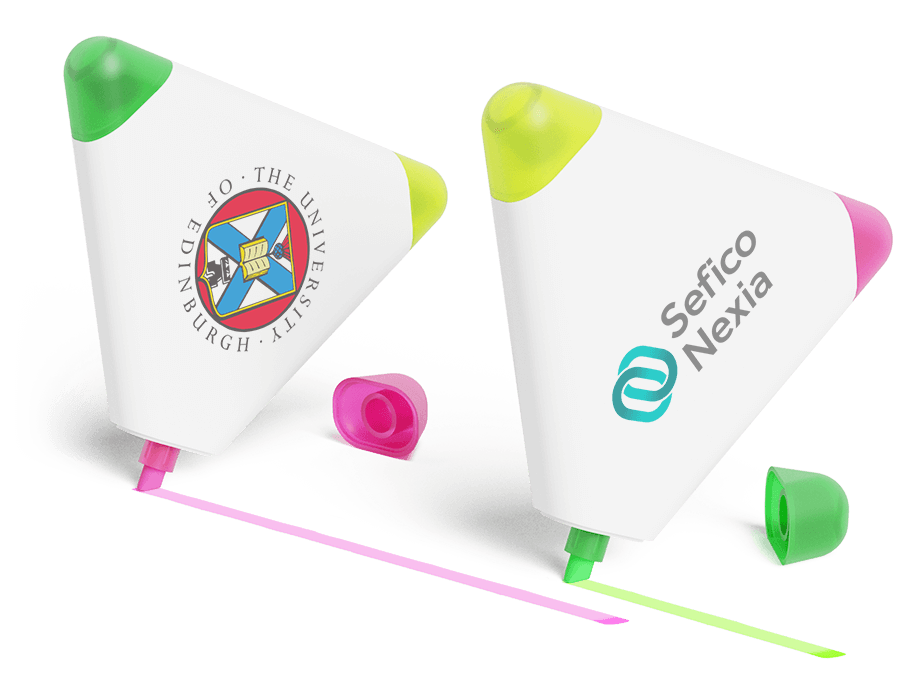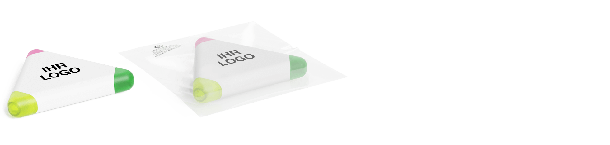 Unser dreifach Textmarkerstift beinhaltet jeweils einen grünen, gelben und pinken Highlighter. Die dreieckige Form ist ebenfalls populär als Giveaway. Wir können Ihr Logo, Ihren Slogan oder mehr auf den beiden Druckflächen aufbringen. Der Druck macht Ihr Unternehmen bekannt auf einem Modell, das häufig und gerne genutzt wird.