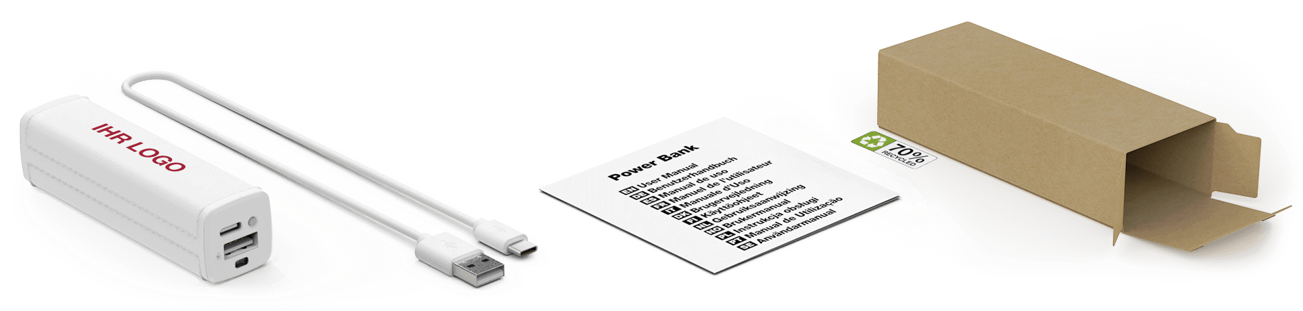 Ihre Powerbank kommt noch besser zur Geltung in einer schönen Geschenkbox, die gleichzeitig als Schutz dient. Die weiße Schaumstoffeinlage wird passend zur Powerbank konfektionieren. Die Box lässt sich weiterhin mit Ihrem Logo bedrucken oder gravieren.