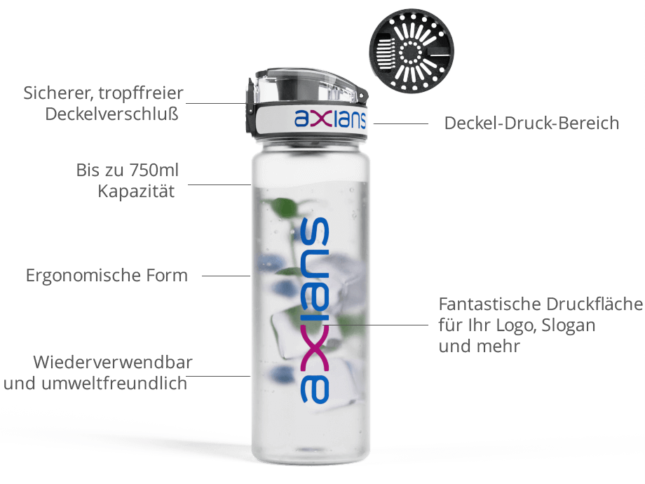 Die Aqualok Infuse ist eine hervorragende Ergänzung für externe oder interne Marketingkampagnen, bei denen die Förderung eines gesunden Lebensstils und Ihrer Marke im Vordergrund steht. Sie kann komplett individuell gestaltet und an die Ästhetik Ihrer Marke angepasst werden - von der Farbe der Flasche bis hin zu den aufgedruckten Motiven.
